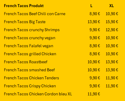 Wir bringen „French Tacos“ aus Frankreich nach Deutschland – gefüllt mit saftigen Zutaten, cremigem Käse, knusprigen Pommes und hausgemachten Soßen. Egal ob vegan, veggie, Shrimps oder ägypitschen Falafel – du wählst, wir zaubern. Wähle die Basis und entscheide dich dann für deine Extras. Alle French Tacos enthalten standardmäßig folgende Zutaten: Tortillaboden, Sauce Algérienne, Zwiebeln, Essiggurken, Rucola, frische Paprika, Pommes frites, Cheddar-Käsesauce, Mozzarella, Petersilie.