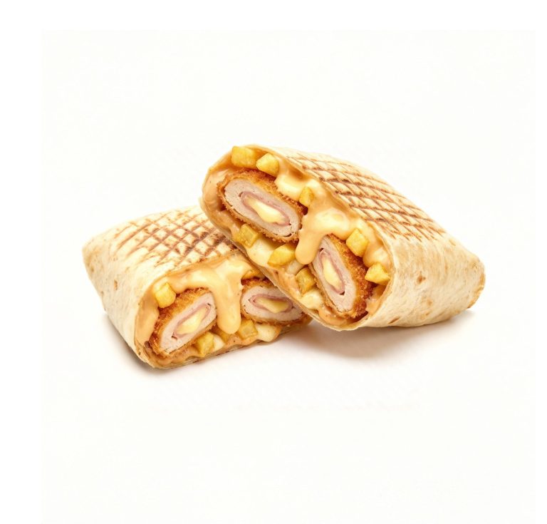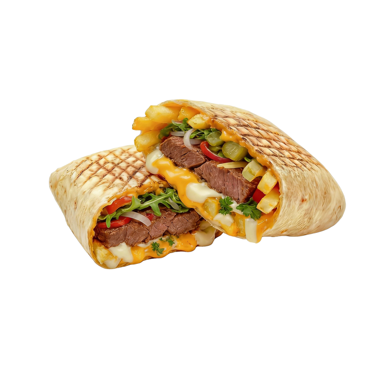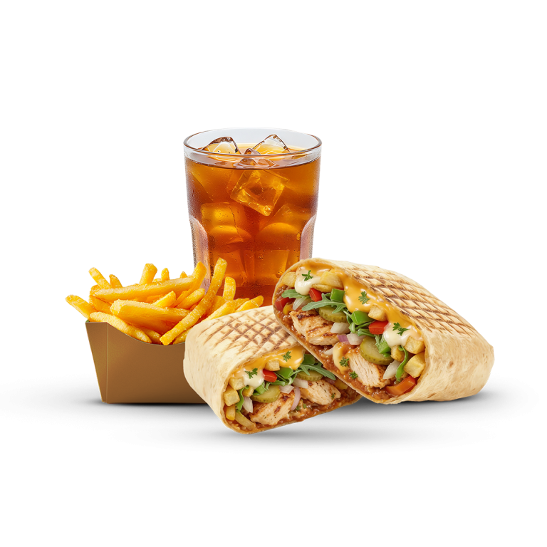 Crispy Chicken, Tender Chicken oder Cordon Bleu eingebettet in eine frisch gegrillte Weizen-Tortilla mit goldenen Pommes, geschmolzenem Mozzarella & Cheddar, knusprigen Röstzwiebeln und unserer legendären Smoky Base Sauce Nr. 13.